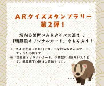 境内6箇所のARクイズに参加いただき、スタンプを全て集めた方に「瑞鳳殿オリジナルカード」を進呈いたします。ご来…